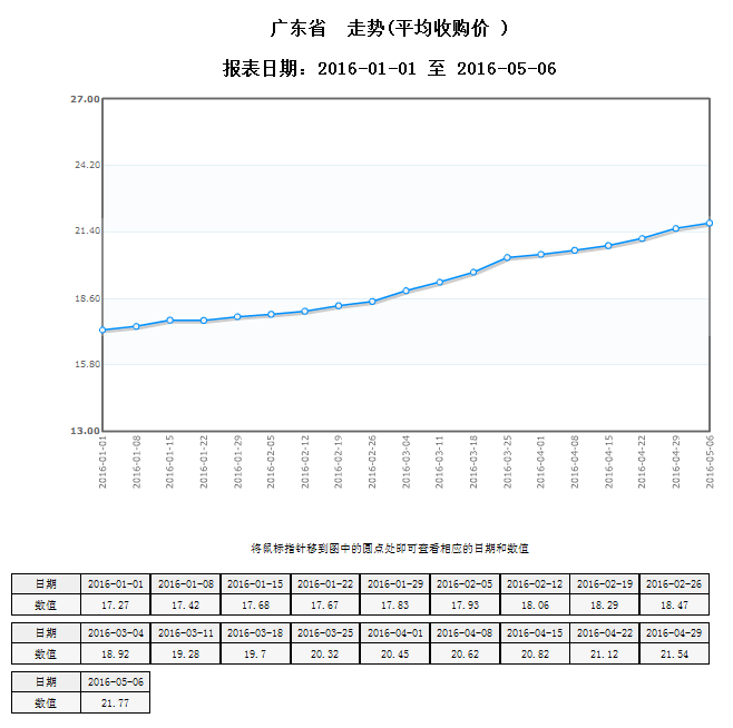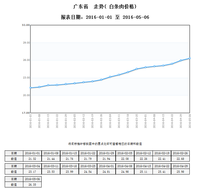 据对全省101家规模以上生猪定点屠宰样本企业监测统计,2016年5月2-8日,生猪平均收购价格为21.77元/公斤,较前一周上涨1.07%,较去年同期上涨50.66%,涨幅较大的地区有东莞市5.02%,汕头市4.55%,广州市3.96%;白条肉平均出厂价格为26.35元/公斤,较前一周上涨1.42%,较去年同期上涨43.83%,涨幅较大的地区有东莞市4.85%,惠州市3.51%,清远市3.16%。