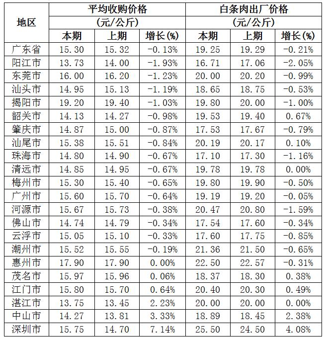 白条肉平均出厂价格为19.25元/公斤,较前一周下降0.21%,较去年同期下降11.94%。本周较上周环比降幅较大的地区有阳江市2.05%,河源市1.59%,珠海市1.16%,但仍有6个市呈上涨态势,其中深圳涨幅超过4%。(畜禽屠宰管理处)