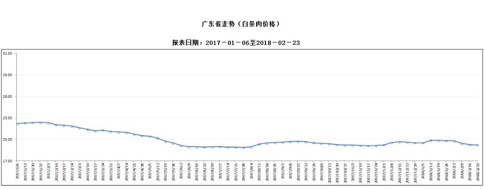 据对全省53家规模以上生猪定点屠宰样本企业监测统计,2018年2月17-23日,生猪平均收购价格为15.30元/公斤,较前一周下降0.13%,较去年同期下降13.85%。本周较上周环比降幅较大的地区有阳江市1.93%,东莞市1.23%,汕头市1.19%,但仍有5个市呈上涨态势,其中深圳涨幅超过7%。