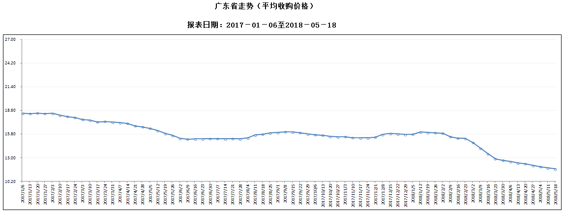 据对全省53家规模以上生猪定点屠宰样本企业监测统计,2018年5月12-18日,生猪平均收购价格为11.69元/公斤,较前一周下降0.93%,较去年同期下降26.43%。本周较上周环比降幅较大的地区有湛江市3.39%,汕头市2.64%,惠州市2.02%,但仍有3个市呈上涨态势。