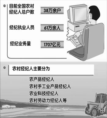 会议透露,据国家工商总局对全国31个省区市的调研统计,目前全国农村经纪人总户数已达38万余户,经纪执业人员达61万余人,经纪的业务量达1707亿元。从种类看,农村经纪人主要分为农产品经纪人、农村手工业产品经纪人、农业科技经纪人、农村劳动力经纪人等。在经营方式上主要以居间和行纪为主。农村经纪人的经纪活动基本覆盖了所有的农产品。其中,培育发展农村经纪人较快的江苏省,农村经纪执业人员已达20万人,经济业务量已近480亿元,占全省第一产业总数的40%。调研情况表明,发展农村经纪人是解决“三农”问题的重要途径。