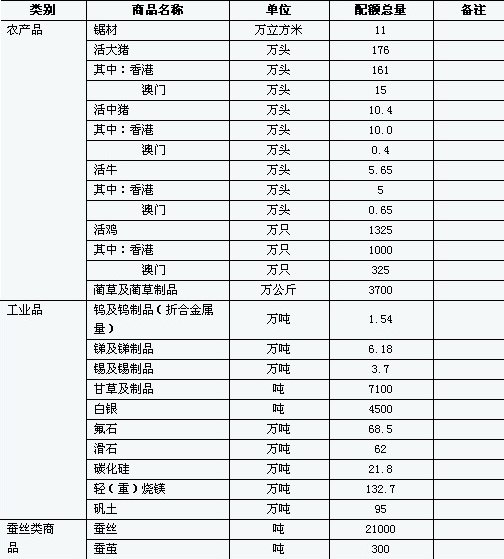 2007年农产品、工业品和蚕丝类商品出口配额总量