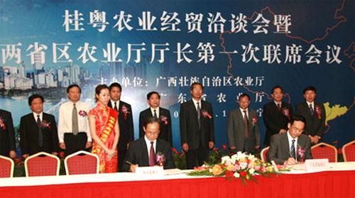 广东省50%以上的粮食要靠从省外调进或从国外进口,40%以上的生猪要从省外调进。前昨(6月10-11日)两天,广东省农业厅又和广西壮族自治区农业厅联合举办粤桂农业经贸合作洽谈会暨两省区农业厅长第一次联席会议,并签署了《粤桂农业合作协议》。
