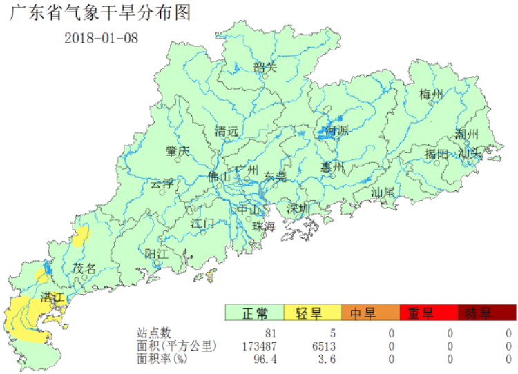 上周(1月1~7日),全省平均气温15.9℃,较常年同期显著偏高1.9℃,其中东北、西南大部偏高2.0~3.3℃,西北偏北正常~偏低0.4℃,其余大部分地区正常~偏高2.0℃;平均日照时数13.9小时,较常年同期偏少近6成,西北大部、东北、东南局部和雷州半岛偏少6~9成,其余大部分地区偏少3~6成;平均降水量61.1毫米,较常年同期偏多3.3倍,其中东北、东南大部偏多4~8倍,信宜偏少5成,其余大部分地区正常~偏多4倍,全省共10个站突破历史同期降水量最高值。上周我省气温偏高、日照偏少、降水前期偏少,周末显著偏多。周前期高温少雨的天气条件对越冬蔬菜的生长发育和蕉柑的果实膨大有利,但对无灌溉设施的在田作物生长及水库蓄水有不利影响。根据气象干旱监测,中南部地区气象干旱持续发展,全省有75个站出现轻度及以上气象干旱;周末受偏南气流影响,全省大部分地区出现大雨到暴雨局部大暴雨,此次降水过程对在田蔬菜、马铃薯、香蕉等作物生长不利,但降水偏多,有利于水库蓄水,并有效缓解了旱情(图3)。目前柑橘类果树为果实成熟期;沙田柚处于花芽分化期;荔枝、龙眼为冬梢生长期。大部分作物长势一般。
