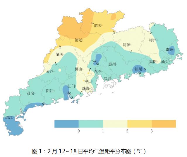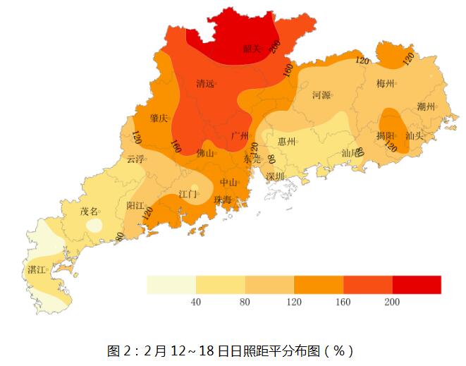 上周(2月12~18日),全省平均气温16.6℃,较常年同期偏高1.0℃,其中西北地区偏高2.0~4.2℃,其余大部分地区正常到偏高2.0℃;平均日照时数39.2小时,较常年同期偏多1.1倍,西北、中部局部、东南局部地区偏多1.2~2.2倍,其余大部分地区偏多2成到1.2倍;平均降水量0.1毫米,较常年同期偏少1倍,全省共72个站点无降水。上周我省气温偏高、日照显著偏多、降水显著偏少。光照充足利于作物光合作用,尤其是对冬种蔬菜生长发育有利,但气温持续偏高,对荔枝花芽分化不利;上周全省降水偏少,对灌溉条件差的地方作物生长也有一定的不利影响。目前柑橘类水果、香蕉处于成熟采收期;荔枝、龙眼为花芽分化期;沙田柚为花芽萌发和春梢萌动期。