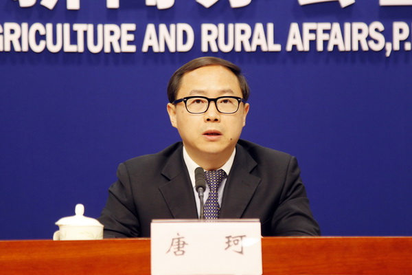 农业农村部于2018年4月17日(周二)上午10时举行例行新闻发布会,通报今年一季度主要农产品市场运行形势,解读当前农产品市场热点问题,并回答记者提问。图为农业农村部市场与经济信息司司长唐珂介绍有关情况。