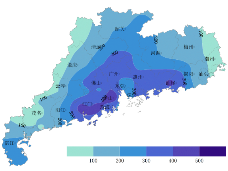 上周(6月4~10日),全省平均气温26.8℃,较常年同期偏高0.2℃,西南、中部局部、东南沿海地区27.0~28.6℃,其余大部分地区24.9~27.0℃(图1),与常年同期相比,西南大部、中部局部和东部局部正常到偏高1.9℃,其余大部分地区正常到偏低1.3℃;全省平均累计降水量220.5毫米,较常年同期显著偏多1.6倍,其中西南、中部、东南局部300~478.6毫米(其中26个站点降水量破历史同期最高),西北、中部偏西、和茂名、潮州大部24.6~100毫米,其余大部分地区100~300毫米(图2),与常年同期相比,雷州半岛、中部局部、西北局部、东南局部地区偏多2~4倍(徐闻偏多7.2倍),茂名、肇庆、清远、潮州局部地区正常到偏少近7成,其余大部分地区正常到偏多2倍;全省平均累计日照时数20.9小时,较常年同期偏少3成,西南、中部局部、西北局部、东南局部地区20.0~44.1小时,其余大部7.8~20.0小时。