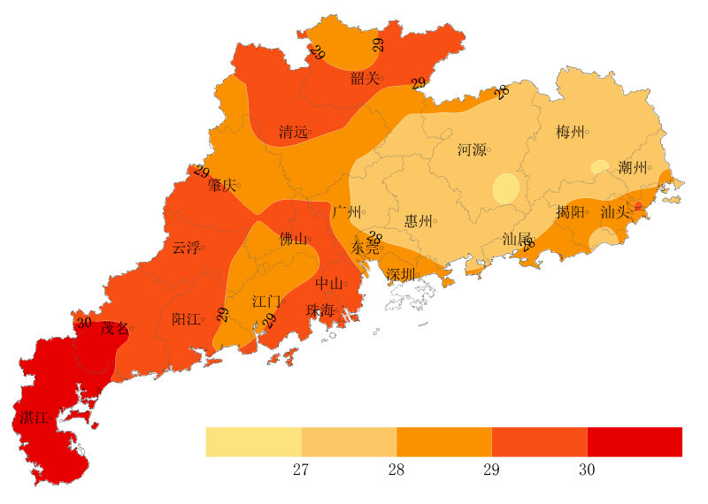 上周(7月2~8日),全省平均气温28.7℃,较常年同期偏高0.3℃,粤东大部、珠三角局部地区26.7~28.0℃,其余大部分地区28.0~30.7℃(图1);全省平均累计降水量48.4毫米,较常年同期偏少1成多;全省平均累计日照时数35.5小时,较常年同期偏少2成多(图2)。