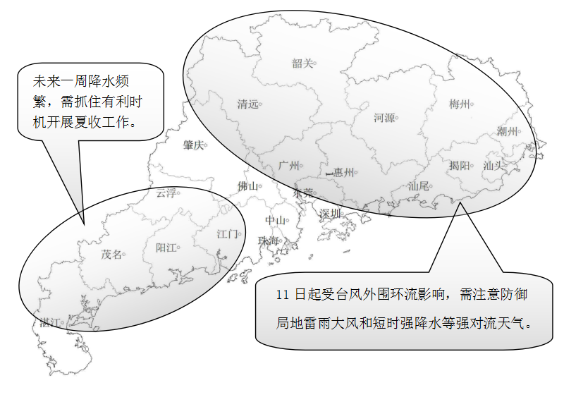 目前广东省早稻大部分地区处于乳熟期,徐闻、台山、中山、高要、潮阳等地早稻已进入成熟期;荔枝处于采摘期;花生处于荚果充实期,部分地区已成熟。上周全省气温偏高、日照偏少、降水偏少,总体上温高光足的气象条件对早稻灌浆、花生荚果发育、成熟水果采摘和各项农事活动的开展有利,广州、惠州局部地区本周阴雨寡照天气为主,对早稻籽粒充实较为不利。