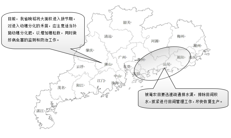 目前我省晚稻大部分处于分蘖-拔节期;秋花生大部分处于开花-下针期;沙田柚、皇帝柑处于果实膨大期;春植蕉部分处于营养生长期;荔枝处于秋梢生长期。本周我省气温偏低、降水偏多、日照偏少。周前期受季风低压影响,我省大部分地区出现大雨到暴雨局部大暴雨到特大暴雨的降水过程,强降水造成农田水浸,果树裂果、落果;同时阴雨寡照的天气不利于晚稻控制无效分蘖,频繁降水不利于柚果、柑果类作物生长,对蔬菜和旱地作物尤其是叶菜类作物也有一定不利影响。