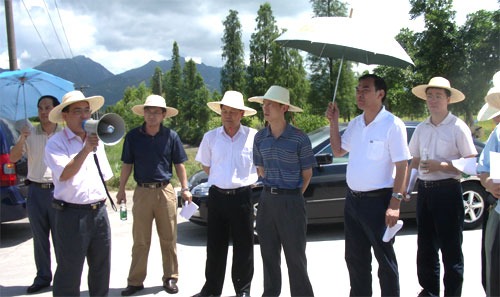 在广东省农业厅蔡汉雄副厅长(右二)、台山市黄国忠副市长(左四)的陪同下考察“广东第一田”测土配方施肥示范区现场。