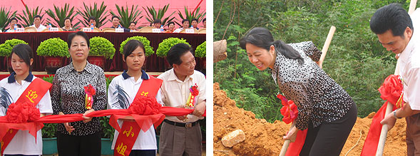 余俭娥副厅长为工程竣工剪彩(图左)和种植纪念树(图右)