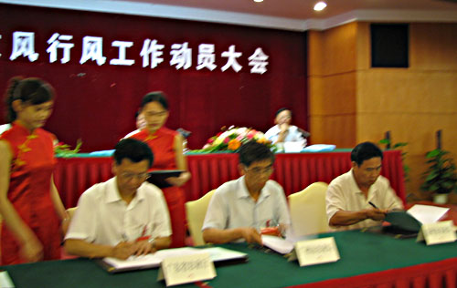 4月24日下午,在全省农业系统民主评议政风行风工作动员大会会场,省农业厅林果先副厅长与全省地级以上市农业局局长签订了安全生产责任书,2006年度我省农业机械安全生产有了明确的目标责任和控制考核指标。在签订安全生产责任书前,林果先副厅长向与会代表传达了全国农业市场信息质量工作座谈会精神,并就我省农业市场信息质量和农业安全生产工作做了具体部署。林果先在讲话中肯定了我省农业系统认真贯彻落实省委、省政府的统一部署,坚持“安全第一,预防为主”的方针,在农机安全生产、农产品质量安全、农业投入品监管等农业安全生产专项工作中开展了卓有成效整治,取得了可喜的成绩。