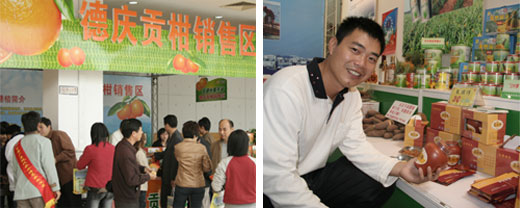 图左为号称“中国柑王”的“德庆贡柑”热卖现场,图右为号称“菜中头名”的遂溪“沙古菜头仔”。