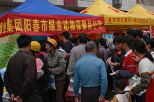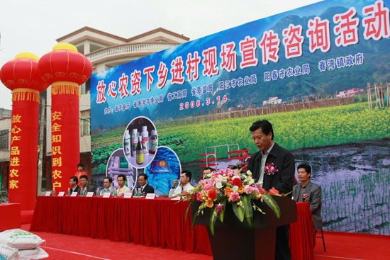 3月14日,由广东省农业厅、省打假办、省整规办、省海洋与渔业局、省质监局、省工商局、阳江市农业局、阳江市畜牧局、阳春市农业局和春湾镇镇政府,联合在春湾镇举办“放心农资下乡进村现场宣传咨询活动”。参加这次活动的有省、市、县农业、海洋与渔业、质监、工商等部门的有关行政执法和技术人员(约60人),省内24家农药、肥料、种子、饲料、兽药、农机及零配件的名优企业,广东电视台、南方日报、南方农村报、省农业展览馆、省农村信息中心和阳江市、阳春市等10多个单位也现场进行采访和报道。
