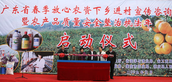 春风引紫气,大地润物华。一年之计在于春,目前正值广大农民朋友开耕备耕的重要时候,一场及时的大雨将南粤大地润了个通透。今天(3月6日)上午,广东省农业厅、省海洋与渔业局、省质监局、省工商局、肇庆市农业局、德庆县人民政府,联合在德庆县官圩镇举办2009年“放心农资下乡进村宣传咨询暨农产品质量安全整治执法年启动仪式”。参加这次活动的有省整规办,省、市、县农业、海洋与渔业、工商、质监等部门的领导、执法人员和专业技术人员,还有30多家农药、肥料、种子、饲料、兽药、农机及零配件的名优企业。潘雪芬副巡视员出席活动并讲话。
