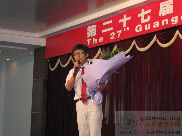 省畜牧兽医局副局长罗展光为获奖种猪企业颁奖