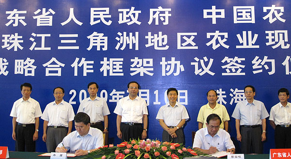7月10日,广东省政府与农业部共建珠江三角洲地区农业现代化示范区战略合作框架协议签字仪式在珠海举行。农业部部长孙政才和省长黄华华出席了框架协议签字仪式。农业部副部长牛盾和副省长李容根分别代表双方签署框架协议。省政府秘书长徐尚武主持了仪式。