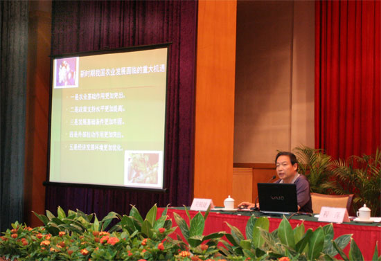 报告会上,关锐捷副司长“以‘三个确保’为目标,加快农业农村经济发展”为报告主题,进一步宣传了党的十七届三中全会提出关于我国农村改革发展的基本目标和任务的指导精神,细致分析了新时期我国现代化建设进程中,农业所面临的严峻挑战和重要战略机遇,提出了当今农民问题的根本核心问题是基本权益问题,要勇于用创造性思维解决所遇到的“三农”问题。同时,关司长还阐述了“以生产能力提升确保国家食物安全,以生产关系变革确保农民基本权益,以生态环境改善确保健康持续发展”的“三生”事业与农业工作者共勉。
