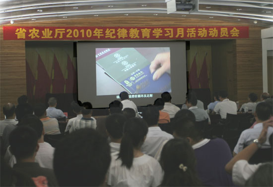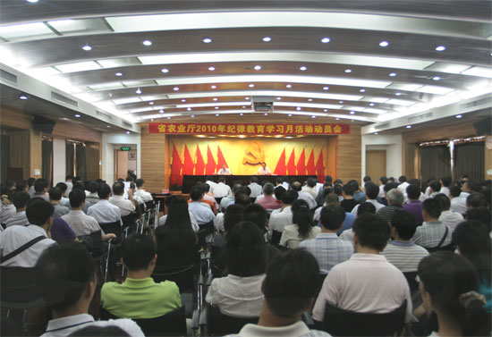 会上,谢悦新厅长就农业厅开展纪律教育学习月活动提出四点要求:一要努力提高思想认识,切实端正学习态度。要求克服“三种情绪”、强化“三种意识”,即克服厌烦情绪,强化自觉意识;克服畏难情绪,强化忧患意识;克服与己无关情绪,强化责任意识。二要紧密联系工作实际,认真做好对照检查。要正确处理服务“三农”与廉洁行政的关系,做到情为民所系、权为民所用、利为民所谋;要正确处理遵纪守法与严格自律的关系,要求在大是大非的问题面前管好自己的脑、管好自己的嘴、管好自己的手,增强遵纪守法的自觉意识;要正确处理党的利益与个人利益的关系,明确全心全意为人民服务的宗旨;要正确处理组织监督与民主监督的关系,进一步增强监督意识,创新监督举措,扩宽监督渠道,提高监督效益。三要创新反腐倡廉举措,建立廉政长效机制。指出反腐倡廉制度建设是惩治和预防腐败体系建设的重要内容,是加强反腐倡廉建设的紧迫任务,要求从教育制度建设、监督制度建设、预防制度建设三方面建立健全廉政长效机制。四要认真抓好组织实施,确保教育学习效果。要求加强组织领导,确保活动落实;抓好典型教育,做好对照检查;认真查找问题,广泛开展批评。
