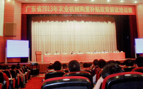广东省2013年农机购置补贴政策解读培训班近日在广州市举行, 400多家农机生产企业代表和经销商代表参加了培训,期间还举行了生产企业、经销商代表签订“承诺书”仪式。省农业厅副巡视员陈华富,省纪委监察厅驻农业厅纪检组副组长监察室主任张利安,省农业厅农机化办主任郑宏宣、副主任黎映驰、刘亚平,省农机试验鉴定站站长姚运仕、副站长熊元芳、马志光,省农机化技术推广总站副站长刘胜敏,省现代农业装备研究所副所长李君略等出席了会议。会议由郑宏宣主任主持。