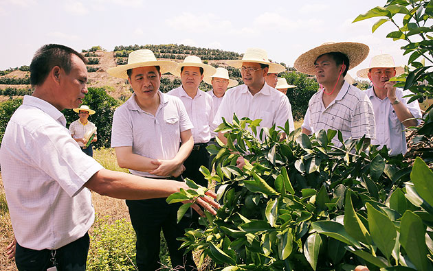 图为郑伟仪厅长一行在廉江青平镇红橙基地调研7月29-31日,为了落实胡春华书记在湛江调研时作出的批示精神,广东省农业厅郑伟仪厅长率调研组到湛江市调研农业农村工作。