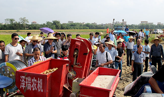 11月5-6日,广东省农业机械化技术推广总站于在茂名组织召开全省区域性冬种生产机械化现场会,贯彻全省冬种生产工作视频会议精神,结合广东省抗击“彩虹”台风救灾复产工作,进一步推进全省冬种生产全程机械化技术的推广应用。现场会演示了适合南方冬种马铃薯机械化生产的旋耕起垄播种覆膜一体机、覆土机、展臂式喷雾机等,展示马铃薯收获机及其它适用机具。电白县美加好农机专业合作社在会上详细介绍了该合作社利用冬种水稻田机械化种植马铃薯的经验,与各种植大户进行了现场交流,取得了很好的效果。