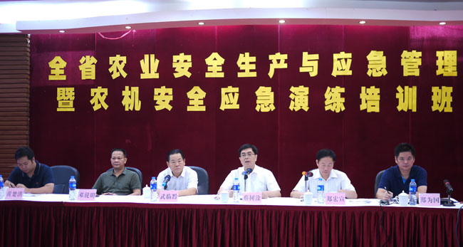 8月17-19日,广东省农业厅在肇庆市高要区举办农业安全生产与应急管理暨农机安全应急演练培训班,分析今年以来全省农业安全生产、应急管理工作形势,开展农业安全生产、应急管理培训交流和农机安全生产应急演练,研究部署下一阶段工作,进一步加强农业安全生产和应急管理工作,保障全省农业生产安全。省农业厅党组成员、总畜牧兽医师蔡树淦回顾总结了今年以来全省农业安全生产和应急管理工作情况,对下一阶段进一步加强农业安全生产、农业应急管理和农业防灾减灾工作提出了要求。培训班邀请省气候中心李春梅副主任讲授了台风等灾害性天气的形成原因和危害后果,观看了由国家安监总局录制的安全生产警示教育片,并观摩了农机事故应急处置演练,肇庆、梅州、江门、湛江市就农业应急管理信息化建设、农业自然灾害防御、农药安全使用监管和农机安全监理等方面进行了专题交流发言。通过学习培训和交流,增强了认识,锻炼和提高了事故灾害的应对处置能力。