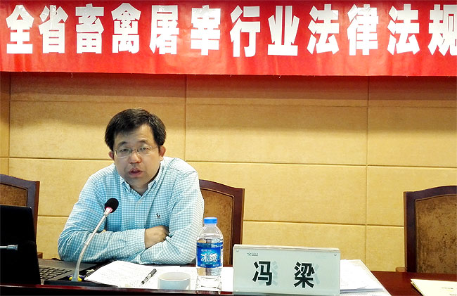 冯梁副处长对近年来广东省畜禽屠宰监管工作取得的成绩给予充分肯定。他指出,广东省农业厅高度重视屠宰管理,工作思路清晰、措施有力,屠宰管理各项工作排在全国前列,亮点突出:一是畜禽屠宰制度建设有章法。建立了屠宰企业备案、屠宰企业责任告知承诺、无害化处理、信访举报登记办理等8项制度,编印了《畜禽屠宰监管工作手册》《肉检员培训教材》《畜禽屠宰常用制度汇编》等一批实用资料;二是工作布局有条理。生猪屠宰监管“扫雷行动”、屠宰资格审核清理、队伍建设人才培训等重点工作有部署、有推进、有督导、有总结、有通报。三是监管难点有突破。在小型屠宰点监管、代宰管理、家禽集中屠宰等热点难点问题上敢于突破创新。四是监管手段有亮点。建立了三厅联动协调机制,健全了重点工作通报机制。五是发展规划有思路。积极推动出台《广东省畜禽屠宰监管工作意见》和《屠宰行业发展规划》,制定了“放心肉”工程等一批储备项目。