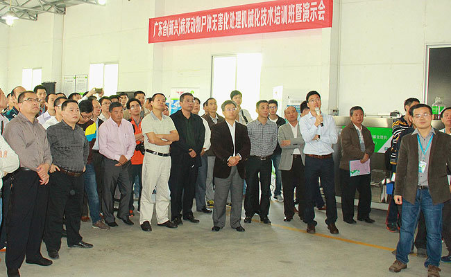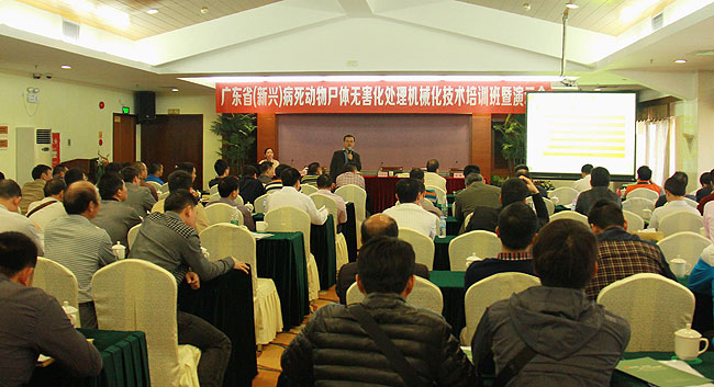 4月15日上午,由广东省农业机械化技术推广总站和省养猪行业协会共同举办的“病死动物尸体无害化处理机械化技术培训班暨演示会”在云浮市新兴县召开,全省10个地市农机推广部门、50多家畜禽养殖和屠宰企业共140多名代表参加了会议。省农业厅党组成员、副厅长牛宝俊出席了会议。